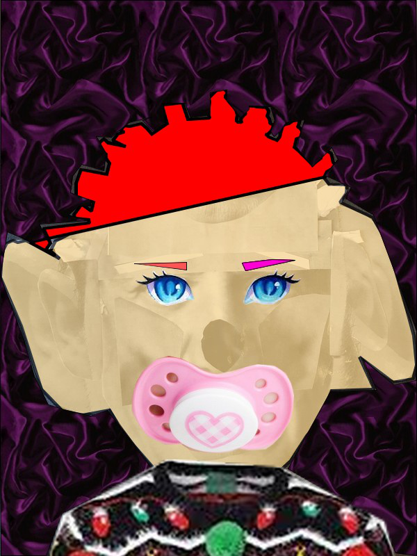Pour faire mon personnage, j'ai mis un fond avec un bout de tissu froisé, je lui ai coloré le haut de la tête en rouge, mis un pull de noel et une tétine. Pour faire ça j'ai copier coller.