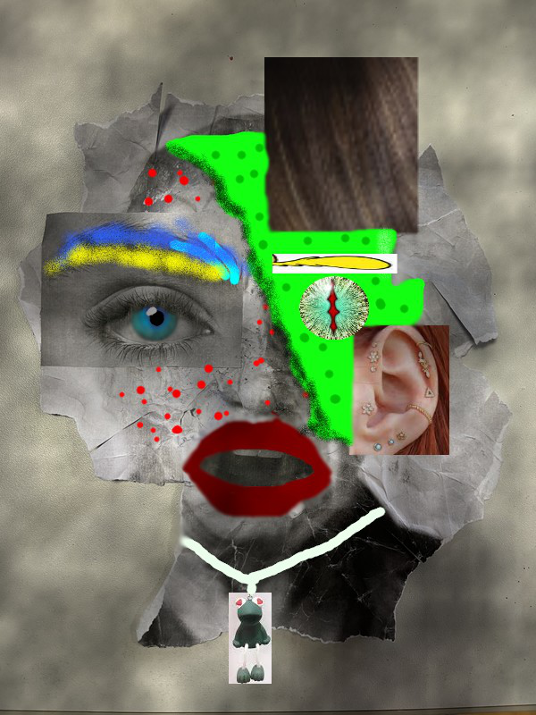 Pour mon personnage après avoir muté, j'ai ajouter des cheveux que sur une partie de son crane, lui ai ajouter une oreille en couleur avec des piercings, une bouche rouge, un œil bleu avec un sourcil bleu et jaune. J'ai ensuite fait une partie de son visage en vert avec des point comme de la varicelle avec un vert plus foncé et pour la seconde partie j'ai juste fait encore comme pour de la varicelle mais avec juste des points rouges. Le second œil j'ai pris un œil d'alien et pour le second sourcil j'ai mis les cheveux de titeuf. Je lui ai ensuite rajouté une chaine avec une grenouille verte qui a des yeux avec des cœurs .