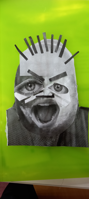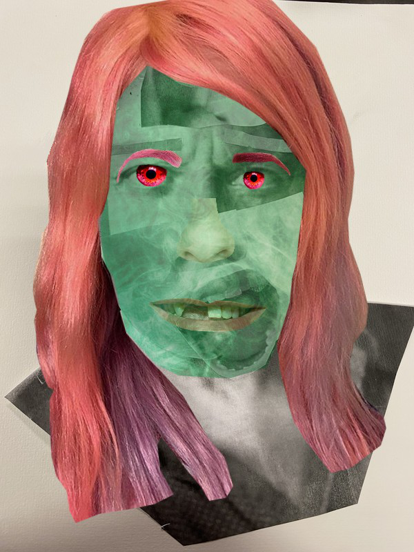 Pour ce projet, j´ai pris des cheveux rose que j'ai ajouté sur le personnage Picasso. J'ai pris deux yeux rouges et je les ai ajouté sur l'image en réduisant leur dimension (même chose pour les sourcils).J'ai mis un nez et une bouche par superposition. Pour finir j'ai mis une brume verte pour donné un effet surnaturel. Mon nouveau visage est entre l'humain et le monstre, un hybride de monstre-humain. Seule la chemise en bas de l'image provient de la 1ère image d'origine de début de projet.