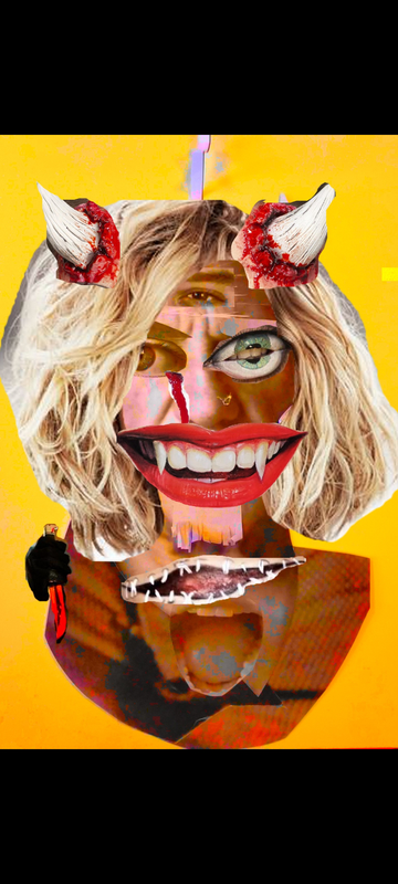 Pour réaliser mon projet j'ai utilisé l'outil saturation pour donner un effet jaune un peu comme un filtre ensuite j'ai pris une bouche de vampire sur internet je l'ai découpé avec le lassot et j'ai fais un copié collé ensuite j'ai fais la même chose avec les cornes d'un démon pour sa cicatrice sur la gorge , pour la main qui tient un couteaux à gauche de mon projet , pour son œil droit . Pour ses cheveux j'ai pris une photo d'une femme sur internet et j'ai découpé ses cheveux et j'ai refait un copié collé