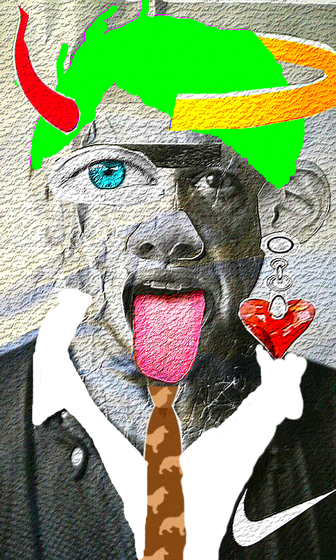 J'ai mis en premier un oeuil bleu a gauche et j'ai aussi mis une langue. j'ai rajouté une boucle d'oreille en forme de coeur, j'ai dessiné des cheveux verts. j'ai ensuite coupé une partie d'auréole d'ange pour la mettre à droite et j'ai pris une corne de diable a gauche. j'ai rajouté une cravate et le signe nike. j'ai dessiné un col de chemise blanche et ai mis un filtre " craquelage".