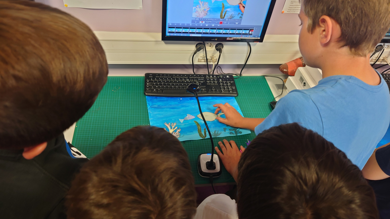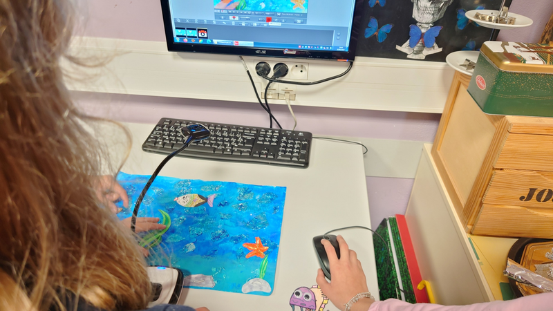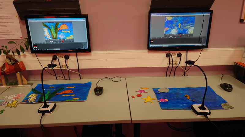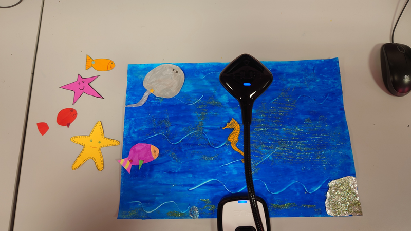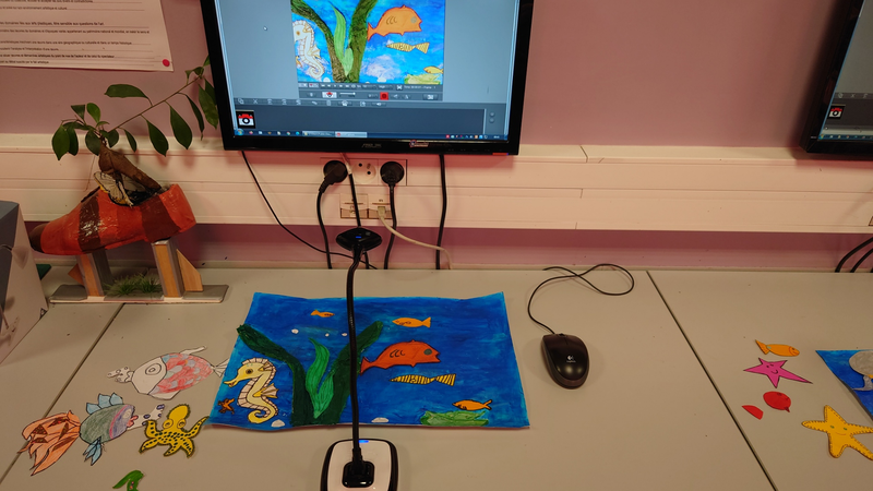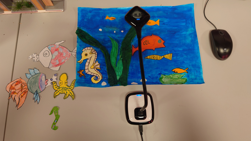 Le plateau de tournage est constitué d'un arrière-plan réalisé par les élèves ainsi que des différentes pièces représentant des être-vivants marins qui seront animés image par image tout au long de la réalisation.