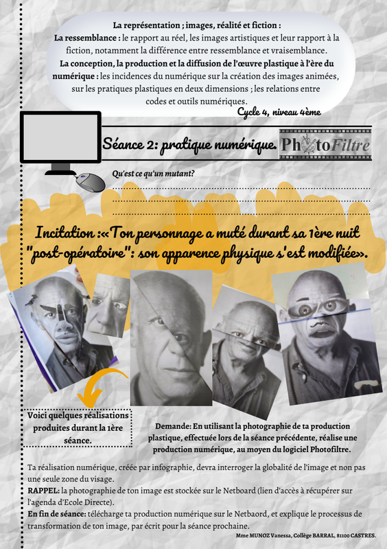 Exemple d'une fiche élève au format PDF pour la séance "Portrait Mutant", production numérique.