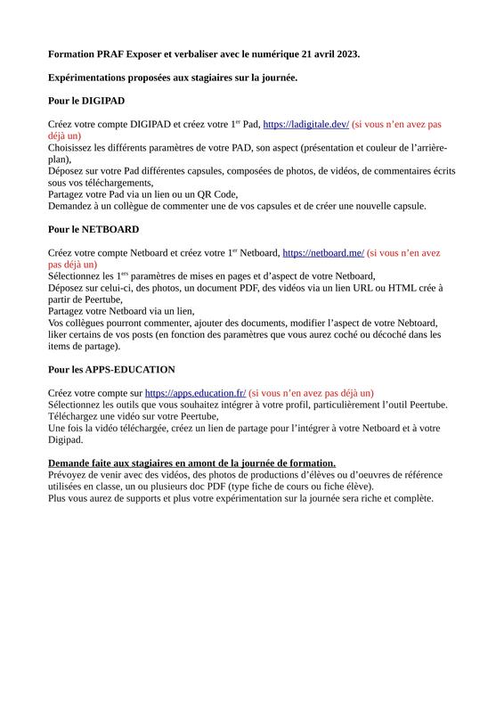 Expérimentations proposées aux stagiaires. Document texte Libre Office.