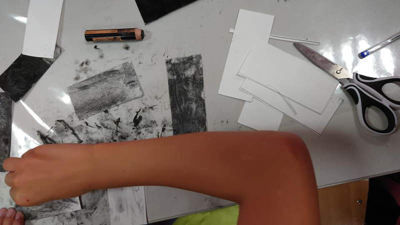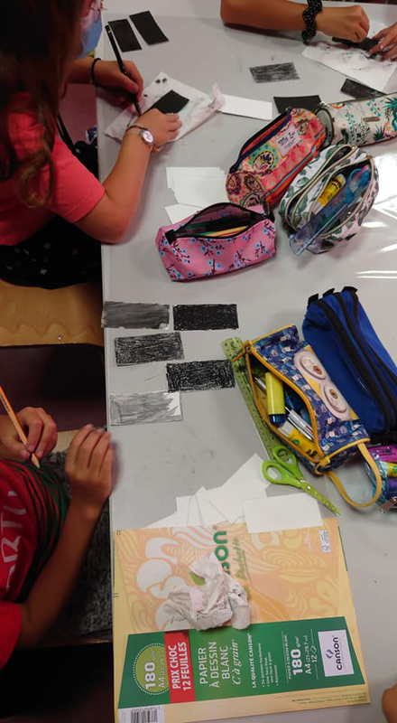 Durant cette 1ère séance les élèves ont à disposition différents outils / médiums, disposées sur les ilôts: pierres noires, fusains, stylos, feutres marqueurs, crayons noirs, encre de chine...